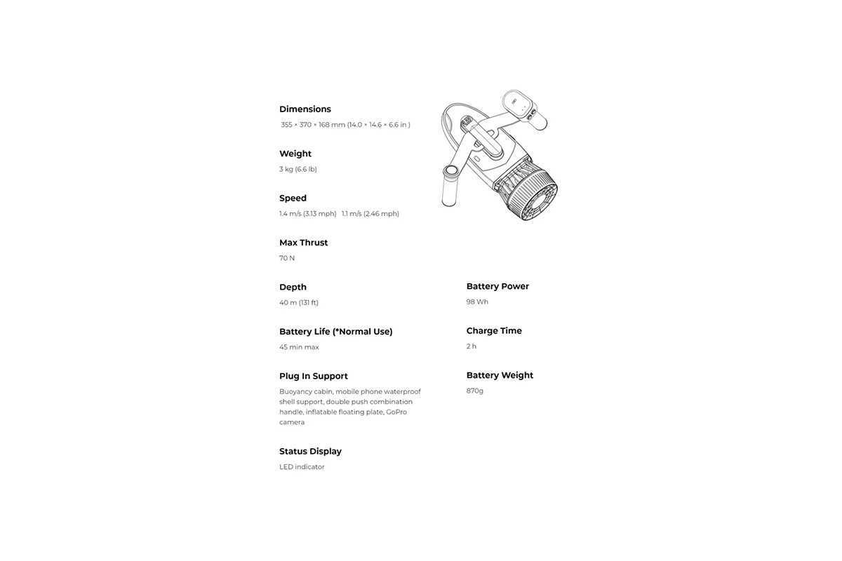 - Speed – 5 km/h with strong dual-propeller thrust.