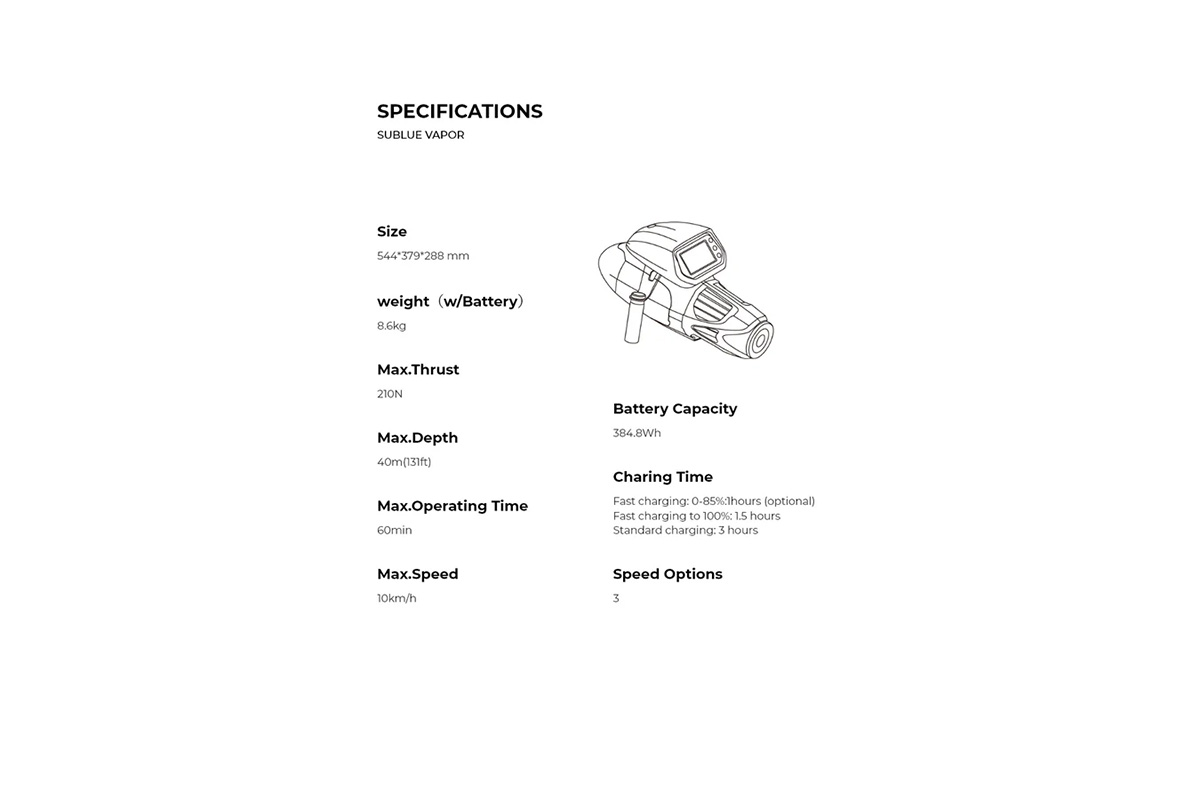 The Sublue Vapor represents the peak of underwater propulsion technology. With a 384.8 Wh smart battery, 210 N thrust, and up to 60 minutes runtime, it’s ideal for deep divers and underwater photographers demanding reliable performance up to 40 m depth.